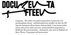 Der Reader zeigt deutlich, dass die vielen Kommunikationskanäle, weit über die documenta hinaus, zum Problem werden können. So konnten die offiziellen documenta-Pressemitteilungen nur verlieren, denn bevor diese veröffentlicht wurden, hatten sich bereits die Rotten, Gangs, Schwärme, Horden, Ellbogennutzer, Standpunktritter, Meinungsprofis und Kotzbrocken in Stellung gebracht und ihre Gläubigen um sich geschart. Das Problem der vielen Kanäle: Wer’s nicht glauben wollte, solle doch einfach den Kanal wechseln. So verdichteten und verhärteten sich die Fronten. Die kanalisierte, Like-gestärkte Selbsterhöhung der Glaubensgemeinschaften demonstriere so ihre Stärke, wenn auch nur virtuell, so doch viral. Auf der Strecke blieb das fluide Denken und die Wissenschaft – der Reader holt da etwas nach. Leider läuft das Nach-Denken den Tatsachen immer hinterher. Doch Diskussionen sind bekanntlich dafür gut, hinterher die richtigen Gedanken zu haben. Und der Reader scheut auch nicht vor so sentimentalen Begriffen wie Gastfreundschaft zurück. Und auch nicht vor einem klaren Statement für den Erhalt der Institution documenta, verbunden mit einer halb ironischen Forderung nach einer Weltkunstausstellung, im Sinne des Weltkulturforums, das es nie zu einer Institutionalisierung geschafft hat.