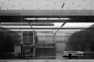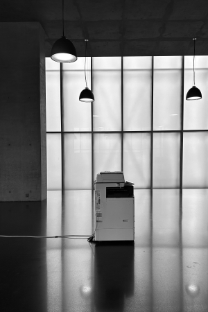 Für mich stellt sich die Frage, warum wird ein Haus im Haus gezeigt, ein funktionales Ding, das man benutzen soll, ohne Dach über dem Kopf, ein versinnbildlichter tatsächlich mit großem Aufwand über vier Etagen gebauter Überbau? Warum überhaupt etwas zeigen, wenn Verweigerung das Thema ist? Vielleicht hätte es auch nur der Kopierer getan.