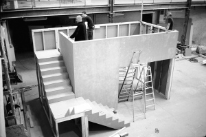 Gregor Winkelhahn, René Lück und Andreas Koch beim Bau des Messestands für das Art Forum 2001