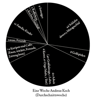 0:00–5:30 Schlaf 5:30 Ungewolltes Erwachen 5:30–6:30 Grübeln im Halbschlaf 6:30 Aufstehen 6:30 Frühstück vorbereiten 6:45 Kind wecken 7:00–7:37 Frühstück mit Kind und Frau 7:37 Kind losschicken 7:37–9:05 Gespräch mit Frau 9:05–10:10 Mailverkehr zu Buchprojekt, danach Spiegel Online, Kicker Online, Bild Online, Express Online 10:10–10:25 Duschen, rasieren, anziehen 10:25–10:50 Mit Bus und U-Bahn ins Atelier (Regenwetter) 10:50–11:10 Kaffee und Facebook 11:10–13:15 Konzepttext schreiben 13:15–13:30 Billige Suppe essen 13:30–14:00 Nickerchen 14:00–15:45 Arbeit an Buchlayout 15:45–17:00 Konzepttext schreiben 17:00–22:15 Vortrag schreiben 22:15–00:00 Essen und Bier trinken.